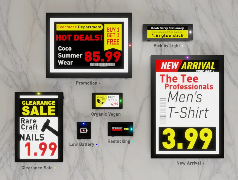 Etiketės yra aprūpintos ekranais, kurie gali rodyti įvairaus tipo informaciją – kainas, akcijas, produkto savybes, sertifikatus ir ženklinimą. Taip pat galima pridėti QR kodą, nukreipiantį klientus į tinklalapį, kuriame jie gali rasti išsamesnės informacijos apie produktą arba įkvėpimo jo naudojimui, pavyzdžiui, receptų idėjų, taip sujungiant apsipirkimo parduotuvėje patirtį su skaitmeniniu turiniu.
